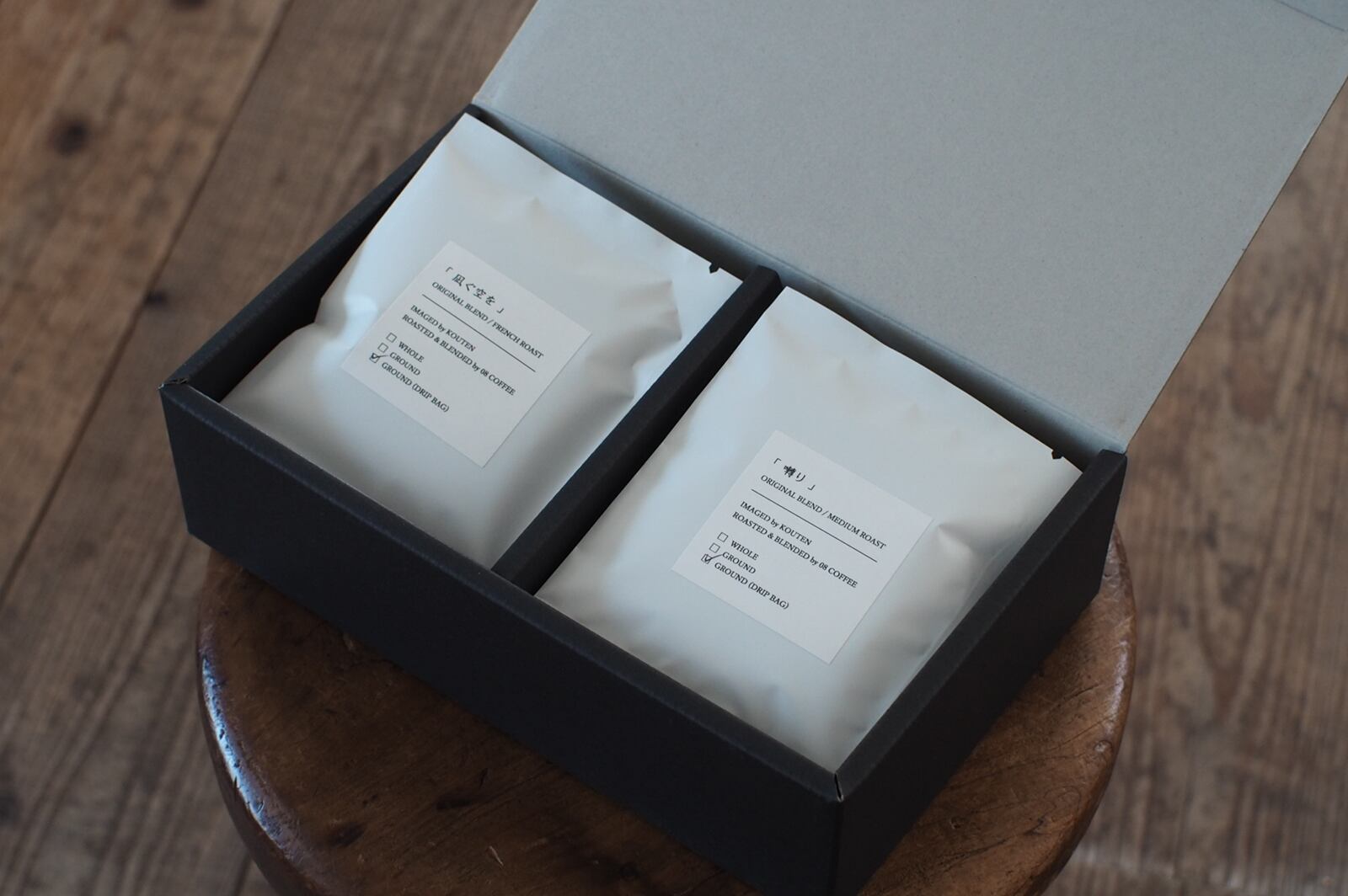 交点のオリジナルブレンドを 10個(看板ブレンド『凪ぐ空を』 5個 + 季節ブレンド『囀り』、『仄月』、『雪花ひとひら』のいずれか 5個)をギフトボックス入りでご用意しました。